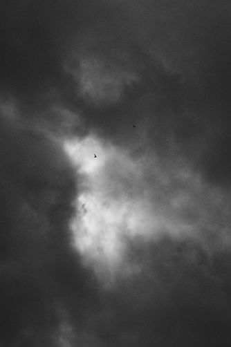 Les nuages constituent un gigantesque royaume au dessus de nos têtes. Ils tourbillonnent, s'agitent, se brisent et disparaissent. Parfois un oiseau émerge de la tourmente. Nous l'apercevons un instant traversant une troué, sa silhouette noire se détache, puis il replonge dans la profondeur opaque des nuages. Seuls eux connaissent vraiment les mystères qu'elle renferme. Partons explorer l'immensité de ce royaume de noir et de blanc, de calme et de tempête, d'obscur et de lumière.